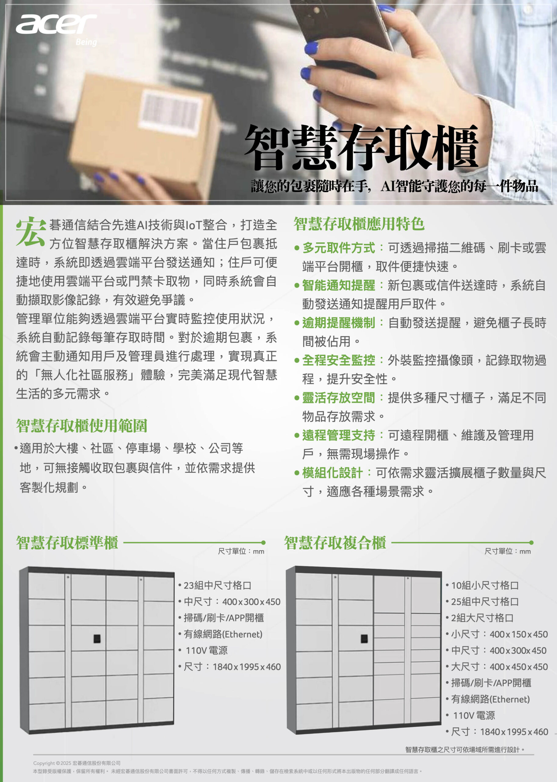 宏碁通信結合先進AI技術與IoT整合,打造全方位智慧存取櫃解決方案。當住戶包裹抵達時,系統即透過雲端平台發送通知;住戶可便捷地使用雲端平台或門禁卡取物,同時系統會自動擷取影像記錄,有效避免爭議。管理單位能夠透過雲端平台實時監控使用狀況,系統自動記錄每筆存取時間。對於逾期包裹,系統會主動通知用戶及管理員進行處理,實現真正的「無人化社區服務」體驗,完美滿足現代智慧生活的多元需求。