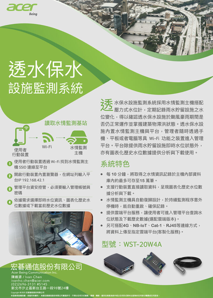 透水保水設施監測系統採用水情監測主機搭配壓力式水位計,定期記錄雨水貯留設施之水位變化,得以確認透水保水設施於颱風豪雨期間是否仍正常運作並掌握建築物滯洪狀態。